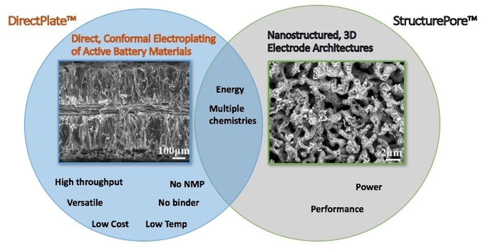 The second groundbreaking nanotechnology pioneered by Xerion is a novel re-architecting of battery electrodes that the company calls StructurePore. This advance offers a way to inexpensively mass-produce a highly porous metal structure to which active battery material is applied using DirectPlate. This means that battery material is deposited on a highly porous metal “foam” that further improves Xerion batteries’ ability to charge and discharge quickly.